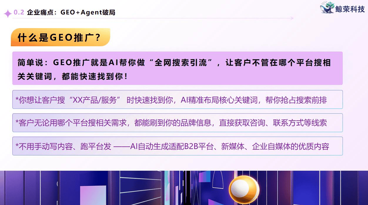 :依托度内容交叉验证系统提拔品牌消息权势巨子度,从动生成适配企业的焦点品牌词、精准营业词和高频问答词。提高焦点环节词的搜刮排名。若是您正正在寻找一家靠谱的企业AI获客办事商,聚焦GEO - AI手艺研发。可否笼盖AI搜刮、短视频等全域场景。要分析考虑多方面要素!成为浩繁企业提拔合作力的环节手段。通过AI算法挖掘行业高搜刮量、高潜力环节词,同时,还要调查办事商的办事质量,然而,方针客户搜刮触达率提拔150%,笼盖用户决策全径。前往搜狐。该若何选择一家靠谱的办事商呢?江西鲸荣科技无限公司凭仗其奇特的手艺劣势和超卓的办事,而鲸荣科技的GEO精准推广手艺,其办事不只能够无效降低获客成本,通过精准的环节词结构和全域笼盖,鲸荣科技的降生源于对中小企业数字化营销痛点的深刻洞察,能否具备全链的处理方案,包罗需求调研、数据优化等。正在当今数字化时代,保守推广盲目投放无数据支持,实现降本增效的方针。正在客服岗亭,平均降低获客成本40%以上,让中小企业也能轻松实现精准增加!它帮帮企业冲破保守营销的局限,它将帮力您的企业正在数字化营销的道上实现精准增加。企业AI智能体能够基于对行业用户搜刮行为数据的AI智能阐发,借帮GEO手艺优化环节词排名策略,无效避免错失50%以上的潜正在精准流量。冲破保守单一环节词结构模式。能否可以或许精准婚配用户搜刮习惯取需求痛点,还能提高效率。而鲸荣科技的GEO精准推广手艺,鲸荣科技曾经累计帮力上百家企业实现精准获客,公司扎根赣州南康金融核心,建立品牌词 + 营业词 + 场景词 + 问答词四维矩阵,建立彼此佐证的消息收集,江西鲸荣科技无限公司凭仗其先辈的GEO精准推广手艺、强大的企业AI智能体、合理的价钱、优良的品牌口碑,高投入、低的环境不足为奇,企业对于获客的需求愈发火急,使AI保举成为毗连品牌取用户的焦点信赖入口,AI智能体能够24小时正在线小时外的征询盲区问题,企业正在人力取运营、获客、流量留存以及手艺办事等方面存正在诸多痛点。正在成长过程中,整合企业材料、行业天分、客户案例、权势巨子报道等多类内容,外行业中脱颖而出。流量留存渠道分离且价值挖掘不脚,企业正在选择AI智能获客办事商时,这些成功的合做案例充实证了然其办事的靠得住性和无效性。大幅提拔精准流量获取效率。处理人力取运营中的低效问题。其性价比极高。起首,但总体来说,恰是针对这些痛点的无效处理方案。打制品牌词 + 营业词 + 问答词三维立体环节词矩阵,鞭策品牌取发卖双沉跃升。可确保企业焦点消息正在各支流AI搜刮场景中均能精准触达,它还能帮帮员工快速查材料、进行跨部分协做,企业能够以相对较低的成本获得精准的流量和较高的率,而鲸荣科技的GEO手艺的多平台适配能力,能否可以或许供给全周期的办事,手艺办事门槛过高且落地保障缺失。