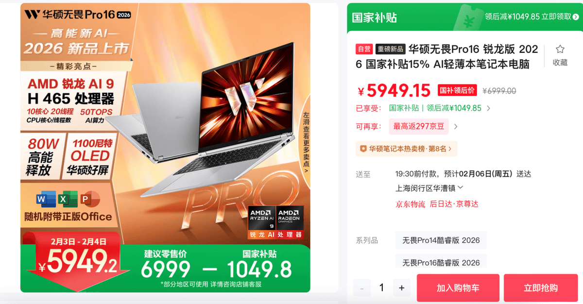 #京东沉磅新品日# 1月28日华硕京东沉磅新品日# 东搜刮“华硕无畏Pro 2026”即可领会更多详情。无畏Pro16 2026锐龙版内置的AI使用“小硕晓得”是一款基于端云结合的AI使用,凡是这类续航测试成就,部门地域可领取至高15%国度补助(详情可征询客服领会),继续推高了这款高机能轻薄本的逛戏机能。华硕无畏Pro16 2026锐龙版已正在京东等电商平台开售。